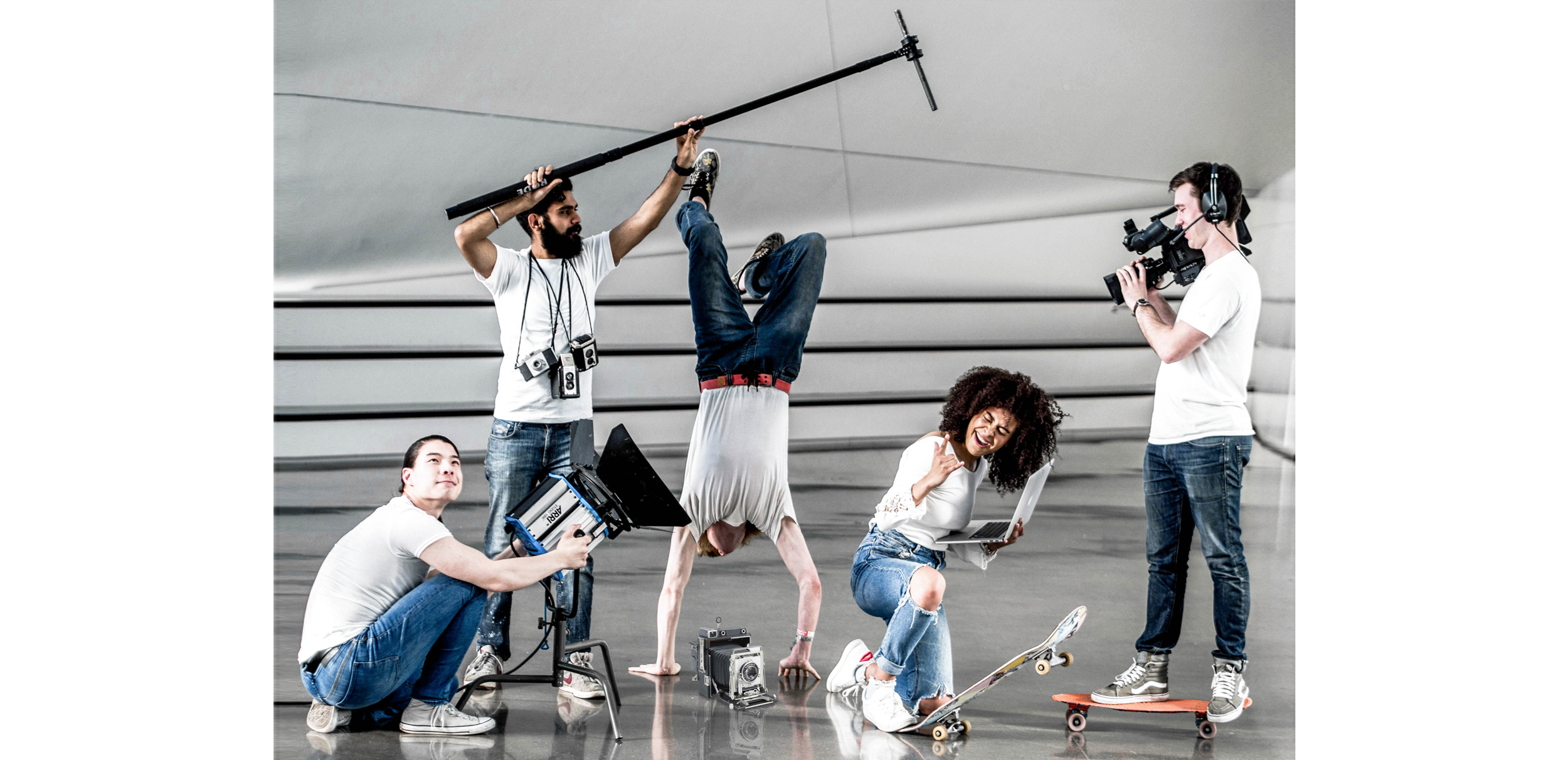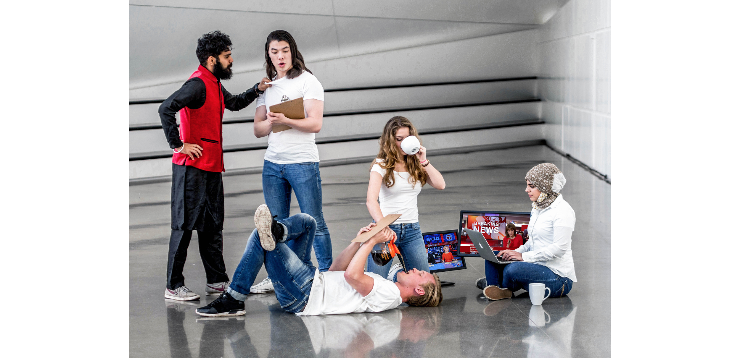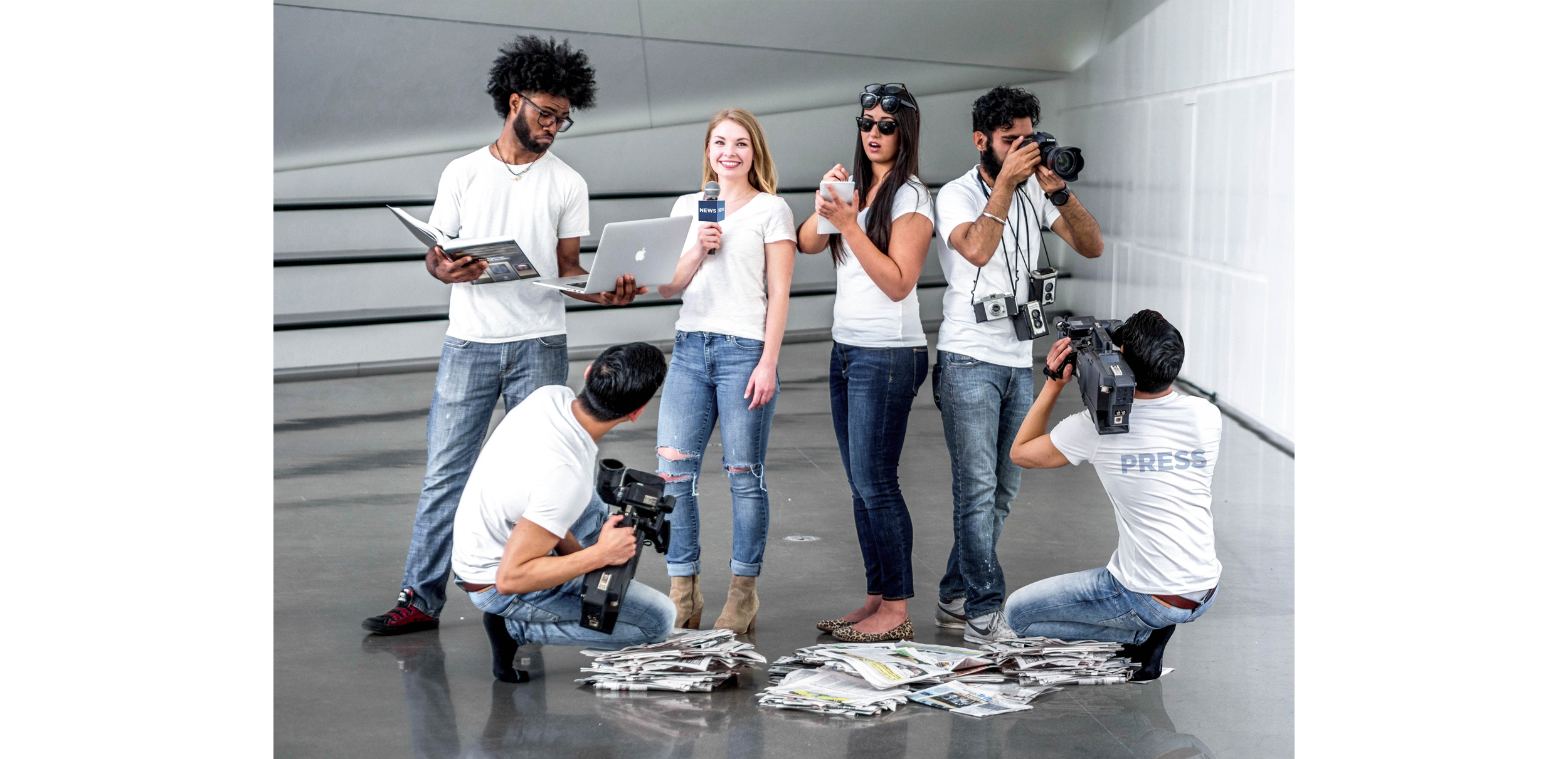 Each photograph consisted of six or seven students "acting out" what a unit at the college does. The seven units of the college are: Advertising and Public Relations, School of Journalism, Communication, Communicative Sciences and Disorders, Media and Information, Media Sandbox, and WKAR.